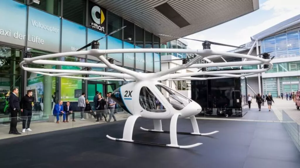 Les engins « VoloCity », à l’allure de gros insectes couronnés, pour leurs modèles biplaces, par 18 rotors, s’avèrent quatre fois moins bruyants que les hélicoptères, selon Volocopter.
